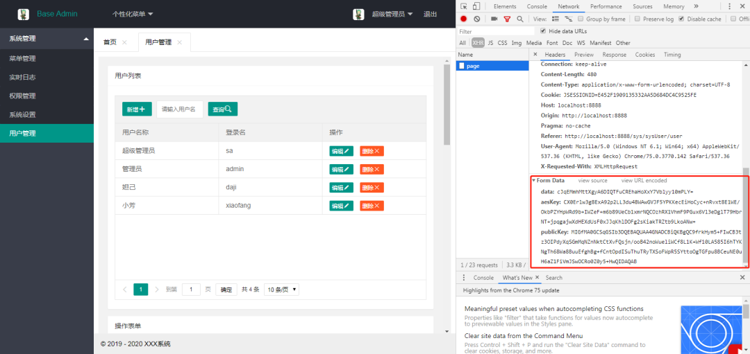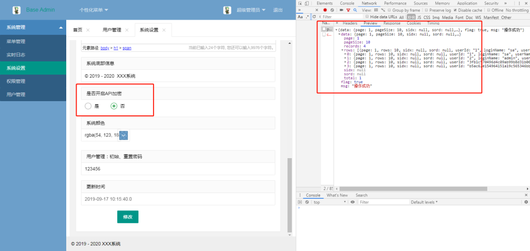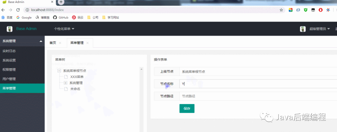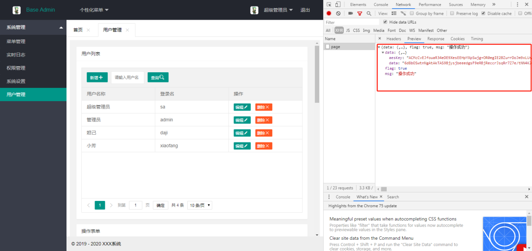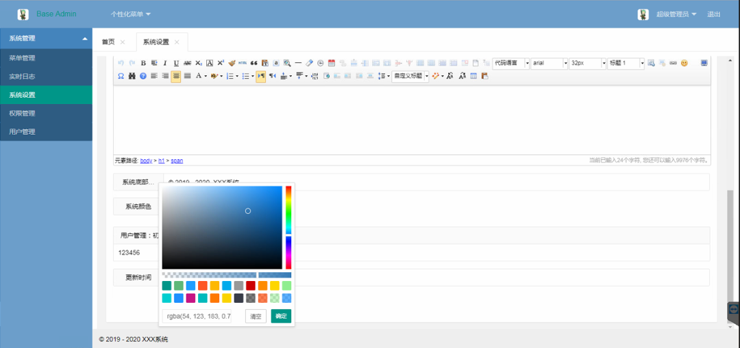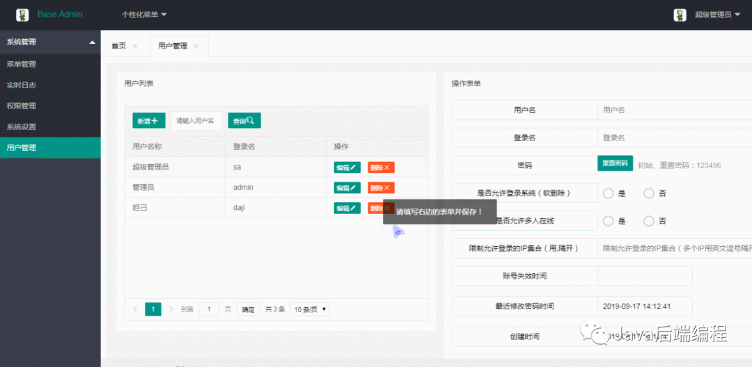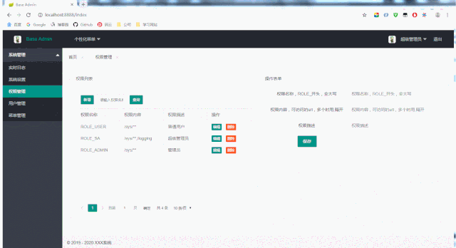 这套Base Admin是一套简单通用的后台管理系统,主要功能有:权限管理、菜单管理、用户管理,系统设置、实时日志,实时监控,API加密,以及登录用户修改密码、配置个性菜单等