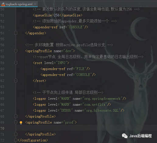 注意:这里的日志配置只配置了dev环境,prod环境尚未为空,发布生产环境前记得先配置,否则生成的日志文件将不会输入日志内容!