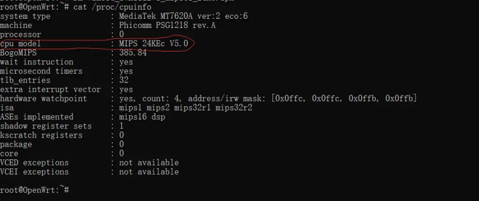 第三步、输入命令 cat /proc/cpuinfo 查看路由硬件信息