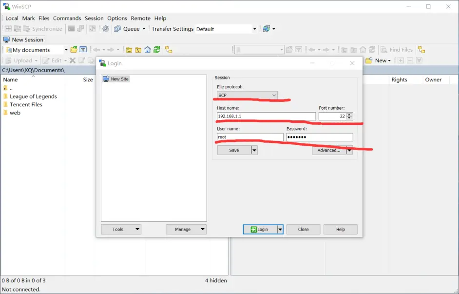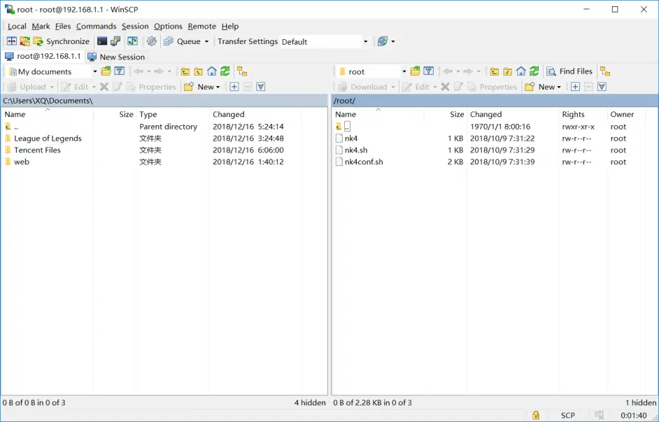 第六步、使用WinSCP软件(或SCP命令将ipk文件上传到路由器/root目录下)