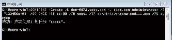 SCHTASKS /Create /S dom-08R2.test.com /U test.com\Administrator /P "123456q!@#" /SC ONCE /ST 11:00 /TN test1 /TR c:\windows\temp\cmd111.exe /RU system