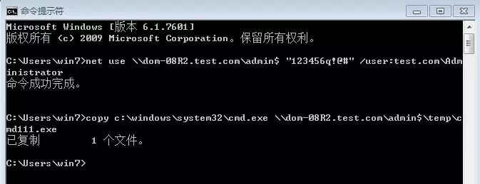copy c:\windows\system32\cmd.exe \\dom-08R2.test.com\admin$\temp\cmd111.exe