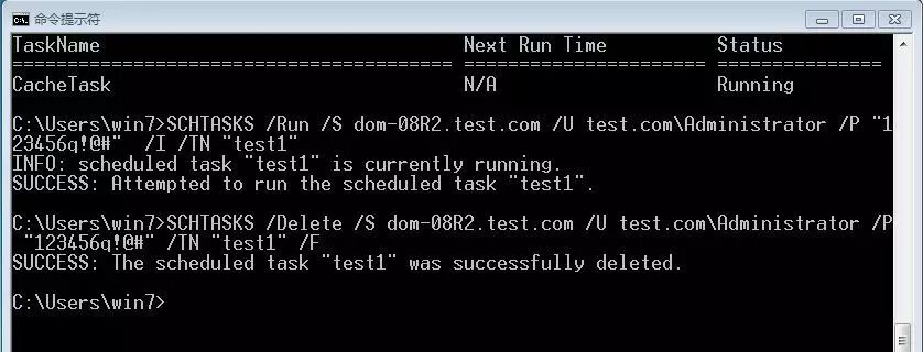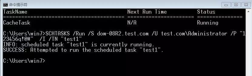 SCHTASKS /Run /S dom-08R2.test.com /U test.com\Administrator /P "123456q!@#" /I /TN "test1"