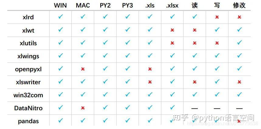 我们先来看一下python中能操作Excel的库对比(一共九个库):