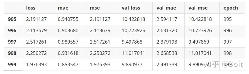 loss mae mse val_loss val_mae val_mse epoch 995 2.191127 0.940755 2.191127 10.422818 2.594117 10.422818 995 996 2.113679 0.903680 2.113679 10.723925 2.631320 10.723926 996 997 2.517261 0.989557 2.517261 9.497868 2.379198 9.497869 997 998 2.250272 0.931618 2.250272 11.017041 2.658538 11.017041 998 999 1.976393 0.853547 1.976393 9.890977 2.491739 9.890977 999