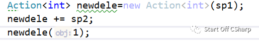 这样,我们之前为委托实例添加的方法,在调用委托时,就根据添加顺序依次调用了,这种通过委托一次性调用多个方法的过程,称作委托的多播。注意,如果委托是有返回值的,那么执行多播以后,委托的返回值是最后添加的方法的返回值,也就是说,之前的方法返回值被依次覆盖掉了。