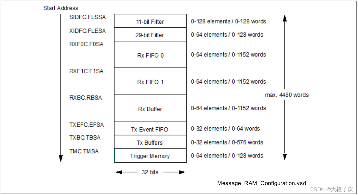 这部分空间由用户开发人员进行配置(设置起始地址和元素个数,有些同时需要设置数据宽度,如Rx FIFO等),所有部分的元素之和一定不能超过 MCMCAN 消息 RAM 的总大小。
