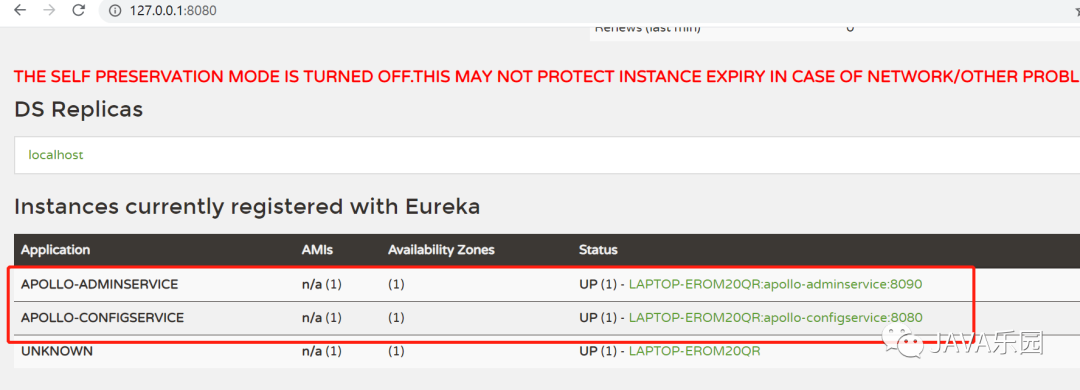 启动完后,打开http://localhost:8080可以看到apollo-configservice和apollo-adminservice都已经启动完成并注册到Eureka。