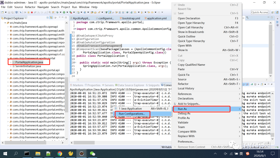 在本地开发时,一般会在IDE中同时启动apollo-configservice和apollo-adminservice。Apollo可以同时启动apollo-configservice和apollo-adminservice,同时启动时使用ApolloApplication类