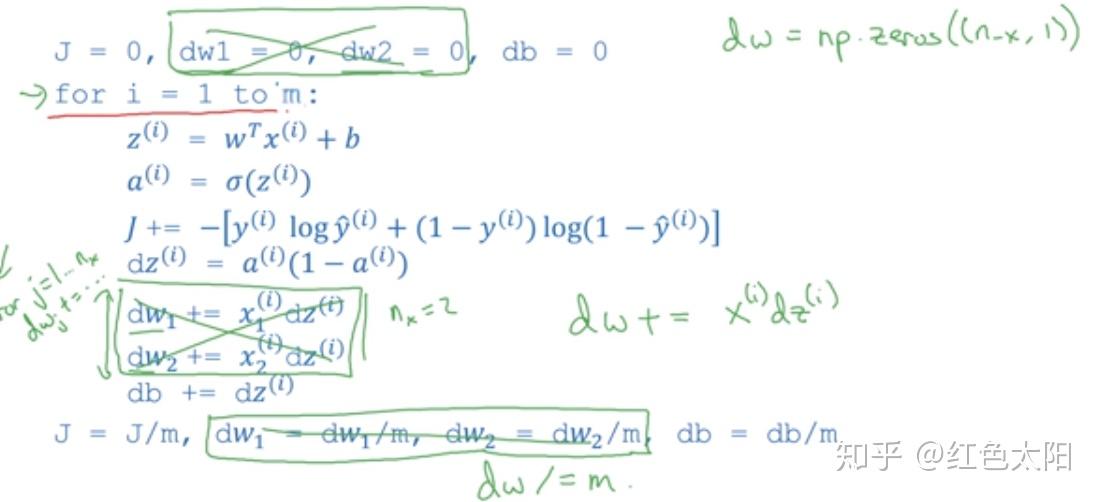 现知道m个样本的损失也就是代价函数,其实这也就是样本1到m项的各个损失的平均,所以它表示代价函数对权重参数的微分。为此,让算法遍历m个样本以后得到权重参数和偏差参数的微分在m个样本上的总和,然后求其平均值,这个值就是全局梯度值,将其用来更新权重参数和偏差参数就是实现了m个样子的梯度下降法。