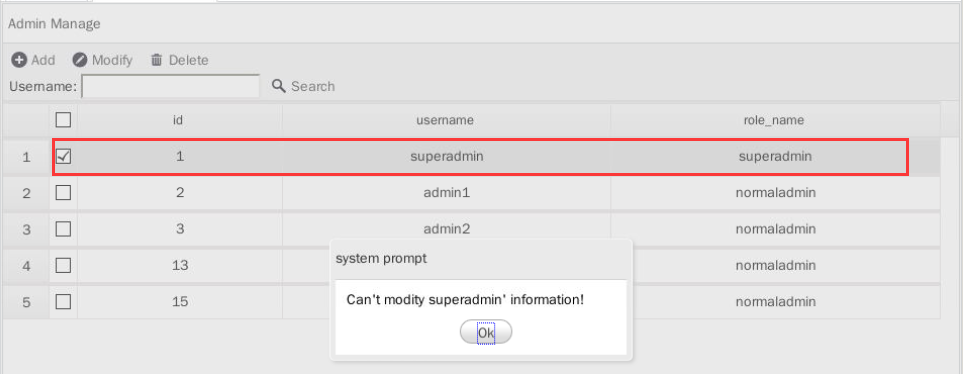 选择 superadmin,点击 Modify 链接,弹出 Can't modify superadmin' information 对话框。