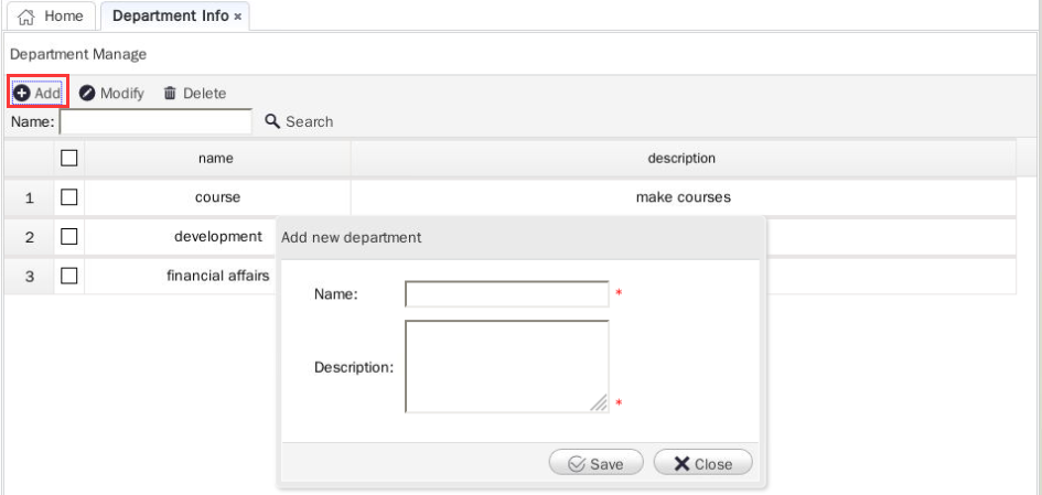部门名称 Name 和描述 Description 均不能为空,输入内容后,点击 Save,保存成功。